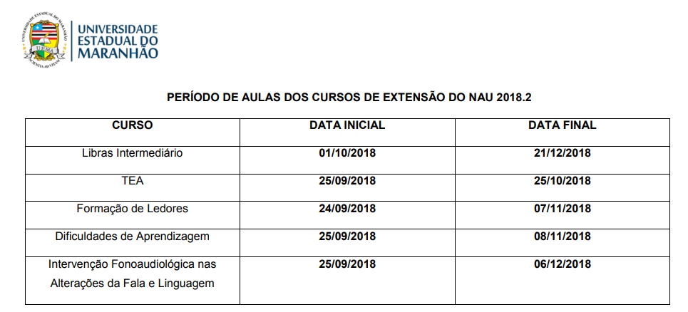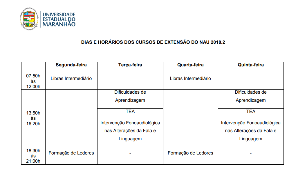 A Universidade Estadual do Maranhão, por meio do Núcleo de Acessibilidade (NAU), oferecerá Cursos de Língua Brasileira de Sinais (Libras) Intermediário, Transtorno de Espectro Autista (TEA), Formação de Ledores, Dificuldades de Aprendizagem e Intervenção Fonoaudiológica nas Alterações da Fala e Linguagem.