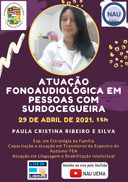 O Núcleo de Acessibilidade da Universidade Estadual do Maranhão (NAU/UEMA) realizará uma live com o tema “Atuação Fonoaudiológica em Pessoas com Surdocegueira”. A live será transmitida quinta-feira (29/04), às 15h, no canal do NAU (Youtube). O evento contará com a participação da Especialista em Estratégia da Família e Fonoaudióloga do NAU, Paula Cristina Ribeiro e Silva. Link da live: https://youtu.be/AmBfSljoZRo