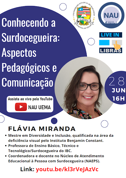 ção”. A live será transmitida segunda-feira (28/06), às 16h, no canal do NAU (Youtube). O evento contará com a participação da Mestre em Diversidade e Inclusão e Coordenadora e Docente no Núcleo de Atendimento Educacional à Pessoa com Surdocegueira (NAEPS), Flávia Miranda. Link da live: https://youtu.be/kl3rVeJAzVc